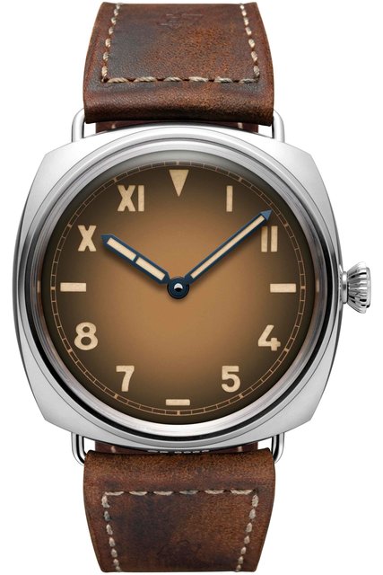 本作は、第二次世界大戦で実際に使用されたオリジナルモデルを再現したものだ。ブラウンのグラデーションが施されたダイアルには、ゴールドのローマ数字、アラビア数字、アワーマーカー、そしてレイルトラックが配されているが、製造当時は軍事機密を含む精密機器であったことから、パネライの名は記されていない。また風防にも、オリジナルモデルに使用されたプレキシガラス®が採用されている。290度から300度の制御された温度で青焼きされたスティール製の針に加えて、ケース素材のAISI 316Lステンレススチールには、長年の着用で生じる摩耗の影響を模したエイジング仕上げを初めて採用。ストラップは、よりそのヴィンテージスタイルを強調しており、素材はイタリアでなめされたオイル加工のカーフレザー“タスカンレザー”で、ダークブラウンにベージュのステッチ入りだ。