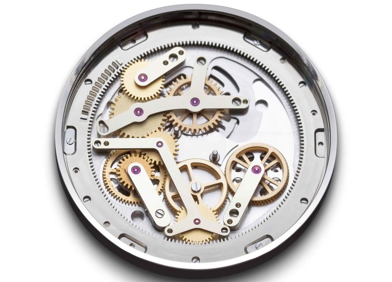 この時計にはリュウズが存在せず、巻き上げおよび調整の機構はケースバックに備わっており、レバーを用いて手動調整が行なえる。これは、リュウズの位置に関わらず、左右どちらの腕にも着用できるという面において、人間工学上から見ても優れたデザインだ。また、ドーム状のサファイアクリスタル製風防はケースの端までを覆い、ケース表面のカーブは非常に滑らかな触り心地だ。視覚的な印象としても、ケースよりもサファイアの質感が勝り、視認性も高められている。