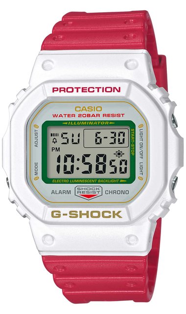 「DW-5600TMN」は、ベースモデルに初号機のデザインを引き継ぐスクエア型の「DW-5600」を採用。フェイスにさりげなく金色の小判のイラストが配されるとともにライト点灯時に招き猫が浮かび上がる、ラッキーモチーフが散りばめられたウオッチだ。カラーは2種類で、それぞれ白と黒の招き猫を表現したシンプルなデザインと、招き猫の毛皮の白に首輪の赤と前掛けの緑を取り入れたポップなデザインで展開される。