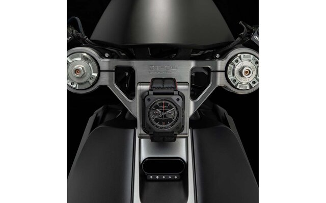 ベゼルはファセットを活かした設計により、上から見ると大胆な八角形を成す。ダークなトーンで統一された文字盤は、グレーとブラックが上品なコントラストを見せ、数字が絶妙なアクセントに。抜け感を演出する格子状の透かし模様が配され、優れた判読性によってすべての情報を容易に読み取ることができる。フランジとインデックスには数字が丁寧に細工され、インデックスとスケルトン仕様の針は、スーパールミノバ® が塗布されている。ベル&ロスとオートバイの恒久的な繋がりを表現するこのウオッチは、オートバイのコンソールのセンターにも装着可能で、文字通りふたつのマシンの融合が実現するのだ。