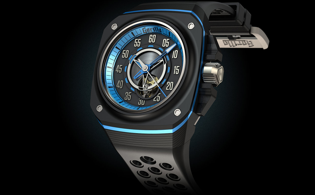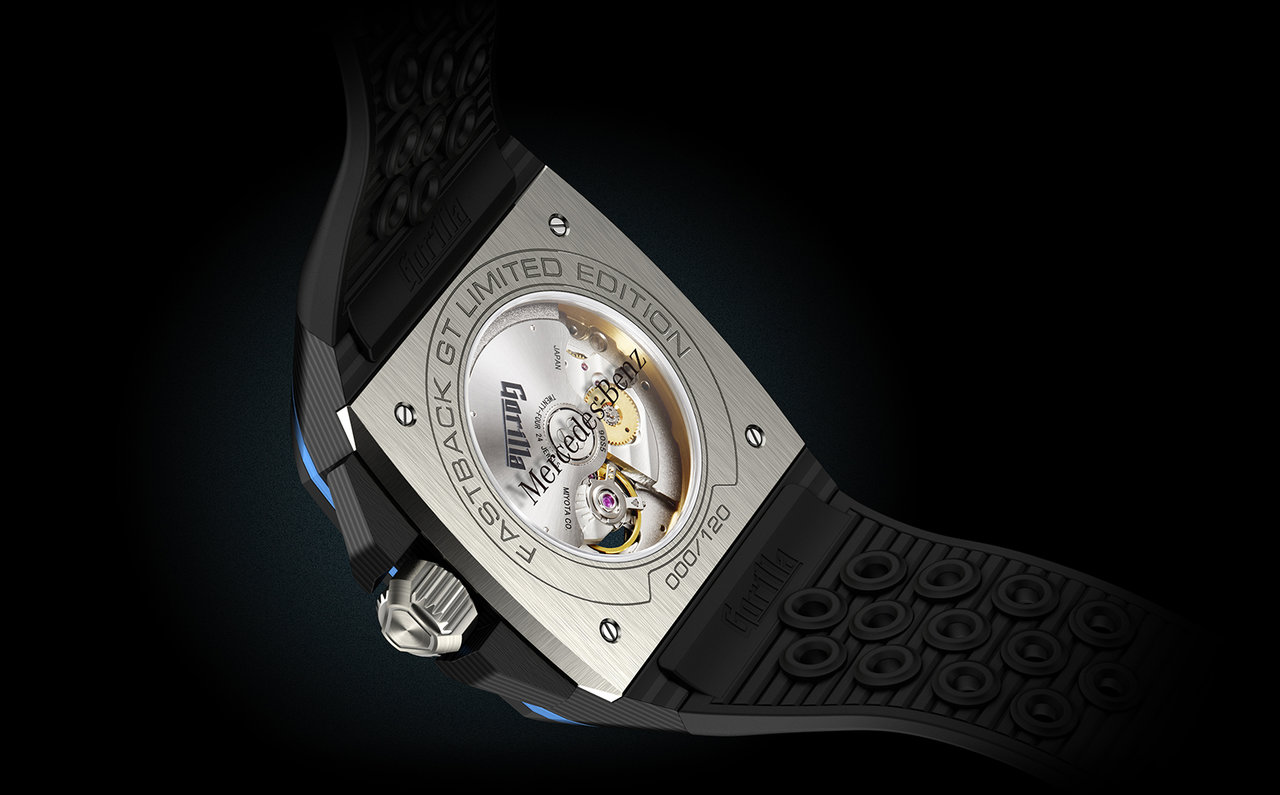 バイトーンのブラック・ラバーストラップとチタン製のバックルがフィット感を生み出し、メルセデス・ベンツをイメージした多層構造のダイアルと中心部の放射線状のヘアライン仕上げが立体感と深みを表現。このモデルでもGorillaらしい強い個性が演出された。