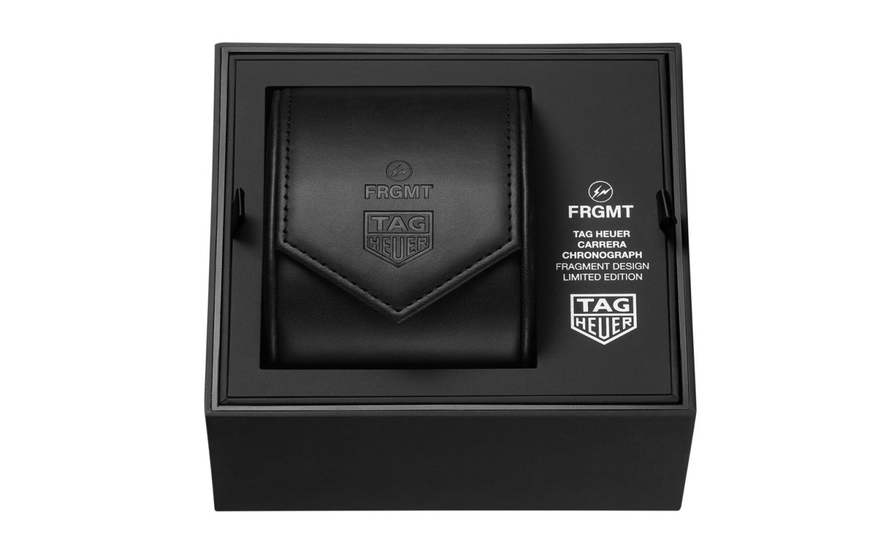 パッケージもこのコラボレーションのために用意されたスペシャルなもの。タグ・ホイヤーとフラグメントのロゴがブラックとホワイトで対照的に配置され、洗練されたブラックボックスにエンボス加工のブラックポーチが付属する。すべてのディテールにエレガンスとブランドのシグネチャーが融合している。