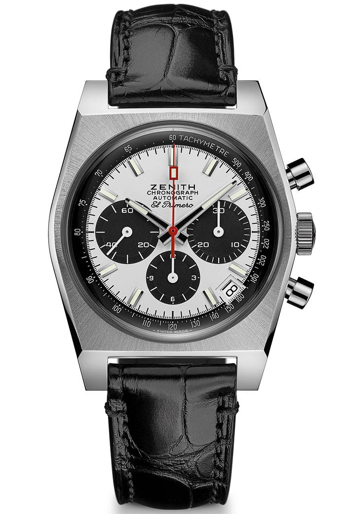ゼニスは、リバースエンジニアリングによって、37ミリのファセットスチールケースから、ラッカー仕上げのホワイト/ブラックのタキメーターダイアルまで、1969年のオリジナルをデジタル化して忠実に再現。オリジナルより改善された点は、アクリルガラス風防に代わってサファイアクリスタルを使用したこと、フルケースバックでなくシースルーケースバックとしたこと、そして半世紀にわたり細かな改善が続けられたエル・プリメロ400クロノグラフムーブメントを搭載したことだ。