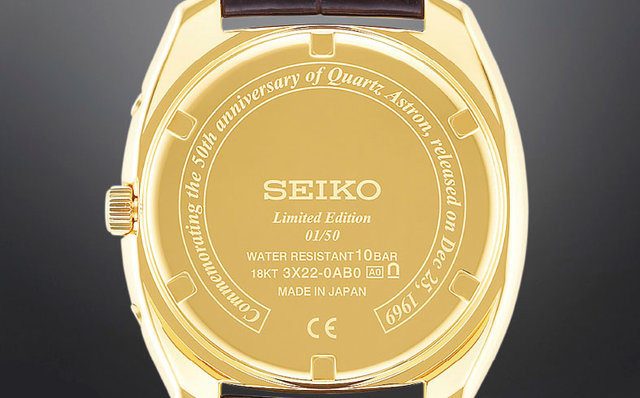 裏蓋には、限定モデルの証として“Limited Edition”の文字とシリアルナンバーが記されるだけでなく、クラシカルな馬蹄型の枠内に“Commemorating the 50th anniversary of Quartz Astron, released on Dec 25, 1969”のメッセージが刻まれた。このトリビュートモデルは、木目の美しい艶やかな無垢材のスペシャルボックスに納められ、限定50本で2019年11月28日(木)より販売が開始される。