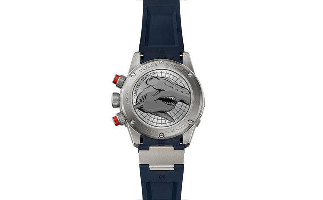 ユリス・ナルダンが新作「ダイバー クロノグラフ 44MM ハンマーヘッド シャーク リミテッドエディション」を発表。44ミリのチタン製ケース側面には、限定ナンバーを刻印したプレートが取り付けられている。